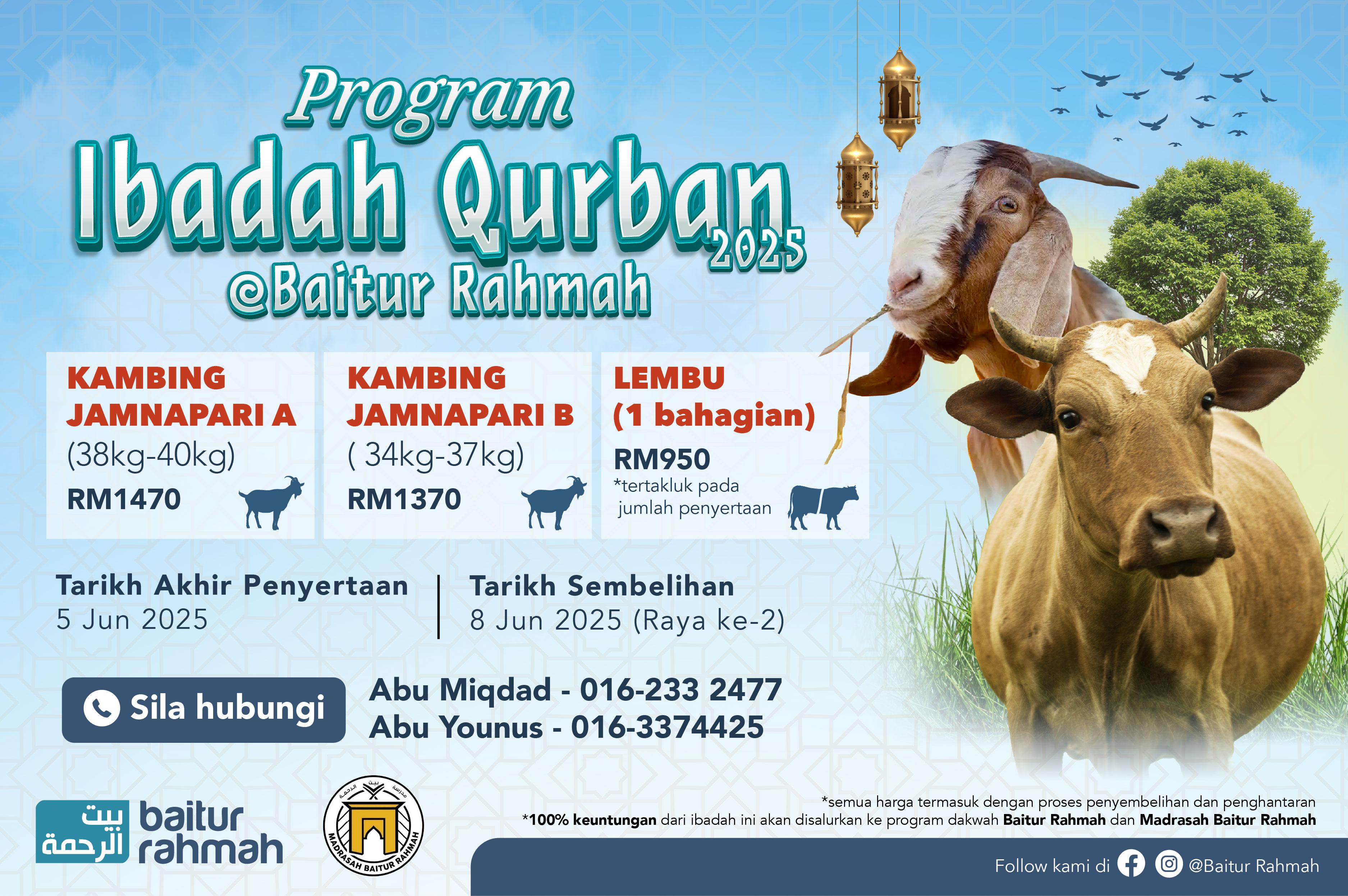 Dengan mengharap wajah Allah Ta'ala, Persatuan Baitur Rahmah Kuala Lumpur sukacitanya mengalu-alukan saudara/saudari untuk melaksanakan ibadah korban bersama kami pada tahun ini (1446H/2025M).